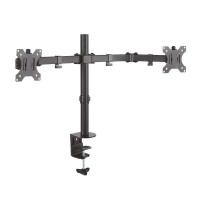 AISENS® - Soporte de mesa eco giratorio e inclinable para monitor/TV (3 pivotes, 2 brazos) de 13?-32?. Fabricado con acero de alta resistencia y pintado con pintura electrostática para un acabado perfecto. Se permite la instalación en la mesa a través de abrazadera o de tornillo pasante VESA Máximo: 100x100mm (Compatible con VESA de 75x75, 100x100mm). Carga Máxima: 8kg / Brazo Angulo de Inclinación: -45º / 45º. Angulo máximo de giro: 360º (depende de la instalación y del espacio disponible). Ángulo máximo de rotación: 180º Sistema de gestión de cables: dispone de unos ganchos para poder agrupar los cables.