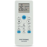 Este mando a distancia Universal Metronic permite sustituir las funciones principales de la mayoria de mandos a distancia de aire acondicionado del mercado. Se puede programar mediante 2 metodos de instalacion: mediante codigo por marca de televisor (mas de 5000 disponibles) o mediante busqueda automatica. Dispone de funcion de Temporizador que permite encender y apagar el aire acondicionado automaticamente. Gracias a las funciones Q.COOL y Q.HEAT es posible obtener un rapido enfriamiento (a 22°C) o calentamiento (a 26°C) con un solo boton. 5 modos de funcionamiento: automatico, frio, deshumidificador, ventilador, bomba de calor. Forma ergonomica. Plasticos de calidad. Funcionamiento garantizado en el tiempo.Fuente de alimentacion: 2 pilas AA, 1,5V modelo AAA (LR3) (no incluidas).Compatibilidad con la mayoria de mandos a distancia de aire acondicionado de todas las marcas. Operacion por infrarrojos. Caracteristicas: -Compatible con Carrier, Daikin, LG, Samsung, Johnson, Panasonic, Mitsubishi, Funai, Fujitsu, hasta 100 marcas -Teletexto: Si -Teclado numerico: Si -Alcance de uso: 8 m -Tipo de bateria: MicroAAA -Numero de baterias necesarias: 2 -Anchura: 5.5 cm -Altura: 13.5 cm -Profundidad: 2 cm -Color: Blanco