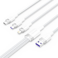 Presentamos el cable USB 2.0 3 en 1 Vention, una solución de carga revolucionaria diseñada para satisfacer todas tus necesidades de carga con un solo cable. Este elegante y moderno cable te permite cargar tres dispositivos diferentes al mismo tiempo, lo que lo hace perfecto tanto para usar en casa como en cualquier lugar. Dile adiós a los cables enredados y a los múltiples cargadores: el cable 3 en 1 Vention simplifica tu vida. Características principales: -Un cable de carga para todos : este cable versátil ofrece compatibilidad con interfaces USB-C, USB-A, Lightning y Micro-B, lo que le permite cargar una amplia gama de dispositivos sin esfuerzo. -Potente capacidad de carga : con una corriente máxima de 6 A y una potencia nominal de hasta 120 W (para USB-C), este cable garantiza una carga rápida y eficiente para sus dispositivos. También es compatible con varios estándares de carga rápida (100 W, 88 W, 66 W, 40 W, 22,5 W y 7,5 W). -Carga simultánea : el diseño único permite cargar tres dispositivos diferentes al mismo tiempo, para que pueda mantener su teléfono inteligente, tableta y otros dispositivos cargados juntos. -Transferencia de datos de alta velocidad : el puerto USB-C admite velocidades de transferencia de datos de hasta 480 Mbps, lo que le permite transferir archivos en segundos. -Durabilidad y estilo : Fabricado con núcleos de cobre estañado engrosados ??y múltiples capas de protección, el cable no solo proporciona una carga eficiente, sino que también resiste el desgaste diario. Su elegante revestimiento trenzado de PVC + algodón y su procesamiento de níquel galvanizado mejoran su durabilidad y estética. -Variedad de colores : disponible en negro, blanco, azul y rosa, este cable atrae a diferentes gustos y estilos. Características: -Longitud : 1,5 m (con una longitud ajustable de 1,2 m + 0,3 m) -Corriente nominal : 6A (USB-C) 2,4 A (Rayo) 2A (Micro-B) -Potencia nominal : 120 W (USB-C) 12 W (Rayo) 10 W (micro B) -Velocidad de transferencia de datos : 480 Mbps (USB-C) -Material de la cubierta : PVC + algodón trenzado -Material de la carcasa : PVC + aleación de aluminio -Diámetro exterior : 3,8 mm