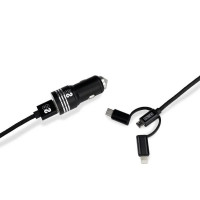 Cargador de coche Subblim doble USB con 2 puertos para carga simultánea de dos dispositivos. Ideal para cargar teléfonos, tabletas, auriculares y power banks mientras conduces. Cuenta con los 3 conectores más utilizados en el mercado: USB-C, MicroUSB y USB-C, garantizando la compatibilidad con cualquier dispositivo y marca. Su exterior de fibra de nailon con trenzado doble ofrece una excelente protección, resistencia y flexibilidad. Además, dispone de un elegante acabado en Aluminio cromado y está sometido a ensayos de dobladura de 90° 10,000 veces para garantizar su durabilidad. Incluye una correa de velcro para ajustar la longitud del cable y evitar enredos, así como un martillo de seguridad con punta de acero de tungsteno extrafuerte para romper la ventana del automóvil en caso de emergencia. Especificaciones: - Color: Negro - Longitud: 1m - Cargador para conectar en la toma del encendedor del coche - Carga rápida hasta 2.400Amp/12W - 2 Puertos USB para carga simultánea de dos dispositivos - Funciones de protección: sobrecalentamiento, aumento de tensiones, reinicio automático en cortocircuitos.