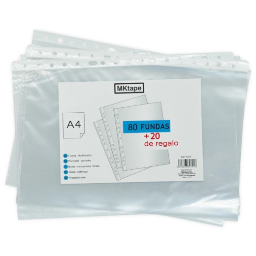 Fundas multitaladro de plástico transparente de 0,5 micras. Tamaño A4. 80 fundas + 20 gratis. Especificaciones: -Color: Transparente -Micras: 0.5 -Para formato: A4