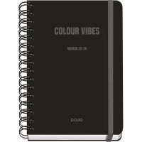 Dohe Colour Vibes Agenda escolar semana vista. Todos los días de la semana en dos hojas. La cubierta está fabricada en cartón forrado con papel impreso a todo color y plastificado mate con puntas redondeadas. Guardas impresas. Una agenda con wire?o metálico de color negro y cierre con goma elástica plana en color gris. Especificaciones: -Tipo: Escolar -Interior: Semana vista -Cubierta: Cartón forrado con papel impreso a todo color y plastificado. -Encuadernación: Espiral wire\'o de metal en color. -Hojas: Papel offset de 80 g/m2 y 4 hojas de pegatinas impresas a todo color. -Certificado FSC Mixto -Tamaño: 15 x 21 cm