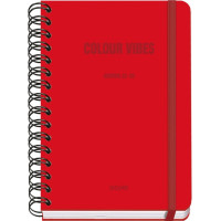 Dohe Colour Vibes Agenda escolar semana vista. Todos los días de la semana en dos hojas. La cubierta está fabricada en cartón forrado con papel impreso a todo color y plastificado mate con puntas redondeadas. Guardas impresas. Una agenda con wire?o metálico de color negro y cierre con goma elástica plana en color rojo. Especificaciones: -Tipo: Escolar -Interior: Semana vista -Cubierta: Cartón forrado con papel impreso a todo color y plastificado. -Encuadernación: Espiral wire\'o de metal en color. -Hojas: Papel offset de 80 g/m2 y 4 hojas de pegatinas impresas a todo color. -Certificado FSC Mixto -Tamaño: 15 x 21 cm