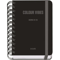 Dohe Colour Vibes Agenda escolar dia pagina. Todos los días de la semana ocupan un página excepto sábado y domingo que comparten hoja. La cubierta está fabricada en cartón forrado con papel impreso a todo color y plastificado mate con puntas redondeadas. Guardas impresas. Una agenda con wire?o metálico de color negro y cierre con goma elástica plana en color gris. Especificaciones: -Tipo: Escolar -Interior: Dia pagina -Cubierta: Cartón forrado con papel impreso a todo color y plastificado. -Encuadernación: Espiral wire\'o de metal en color. -Hojas: Papel offset de 80 g/m2 y 4 hojas de pegatinas impresas a todo color. -Certificado FSC Mixto -Tamaño: 12 x 17 cm