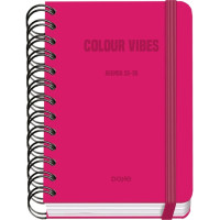 Dohe Colour Vibes Agenda escolar dia pagina. Todos los días de la semana ocupan un página excepto sábado y domingo que comparten hoja. La cubierta está fabricada en cartón forrado con papel impreso a todo color y plastificado mate con puntas redondeadas. Guardas impresas. Una agenda con wire?o metálico de color negro y cierre con goma elástica plana en color rosa. Especificaciones: -Tipo: Escolar -Interior: Dia pagina -Cubierta: Cartón forrado con papel impreso a todo color y plastificado. -Encuadernación: Espiral wire\'o de metal en color. -Hojas: Papel offset de 80 g/m2 y 4 hojas de pegatinas impresas a todo color. -Certificado FSC Mixto -Tamaño: 12 x 17 cm