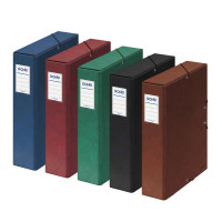 Cajas en cartón forrado con papel impreso y plastificado. Sistema cierre con gomas elásticas. Lomo 7 cm.