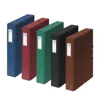 Caja de proyectos en cartón forrado con papel impreso y plastificado. Caracteristicas: -Tarjetero en el lomo -Cierre de gomas elásticas -Con Certificado FSC Mixto -Medidas: 245 x 350 x 50 mm -Colores Surtidos: 3 Azules, 3 Negras, 2 Rojas, 2 Verdes y 2 Cuero