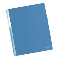 Carpeta con 20 fundas tamaño A4 y tapa de polipropileno opaco de 800 micras. Fundas transparentes en interior de 80 micras. Espiral de plástico de color y gomas elásticas a juego.