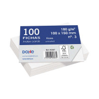 Fichas de cartulina offset blanca de 180 g, lisas. Se sirven en paquetes de 100 fichas. Con certificado FSC.