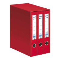 Modulo de 3 Archivadores destinados a proteger los archivadores y su contenido, están fabricados en cartón reforzado acanalado, forrado con papel impreso en color en exterior. Especificaciones: -Tamaño: A4 -Cartón forrado con polipropileno. -Cantoneras metálicas. -Ollao, rado y palanca de máxima calidad. -Medidas: 290 x 325 x 160 mm -Color: Rojo