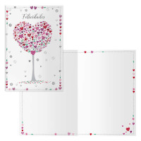 Tarjeta de felicitación de cumpleaños. Tamaño 11,5 x 17 cm cerradas (23 x 17 cm abiertas, impresas a todo color, con estampaciones con película de color y estampación en seco. Realizadas en papel offset blanco de 300 gr. Incluye sobre de color. Con certificado FSC Mixto.