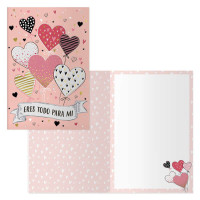 Tarjeta de felicitación de San Valentín. Tamaño 11,5 x 17 cm cerradas (23 x 17 cm abiertas, impresas a todo color, con estampaciones con película de color y estampación en seco. Realizadas en papel offset blanco de 300 gr. Incluye sobre de color. Con certificado FSC Mixto.