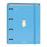 Carpeta A4 recambio con goma 280 x 320 x 40mm. Cubierta en cartón forrado con papel impreso a todo color y plastificado brillo. Guardas impresas. Mecanismo de 4 anillas mixtas niqueladas de 35mm. con compresor de plástico y cierre de goma elástica ancha plana azul. Interior de 100 hojas, papel offset de 90 g/m2 con 4 taladros y cuadrícula de 5mm con banda de color. Incluye: 4 separadores cartulina impresa a todo color y plastificado mate. ? Sobre polipropileno Transparente multitaladro, con cierre velcro. Con Certificado FSC Mixto. Especificaciones: -Tamaño: A4 -Recambio: 100 hojas con 4 taladros y cuadrícula de 5 mm con banda de color. -Separadores: Si -Diseño: Santoro Felines -Medidas del archivador: 280 x 320 x 40mm