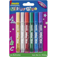 IMEDIO Glitter Glue: brillantina creativa para diversos materiales. Para crear fotos, tarjetas de felicitación, papel de envolver, marcos de fotos y mucho más con brillantes efectos entelleantes. El tubo extrablando con boquilla de precisión permite decorar de forma limpia y precisa, y es ideal para las manos pequeñas. No gotea ni deja hilos. IMEDIO Glitter Glue no tiene disolventes, se lava con agua y está dermatológicamente probado. Disponible en los colores Original y Brilla en la oscuridad. Campo de aplicacion: Apta para diversos materiales, como papel, cartón, madera, etc. Características: -Para distintos materiales. -Tubo extrablando. -Boquilla de precisión. -No gotea ni deja hilos. -Sin disolventes. -Dermatológicamente probado. Especificaciones: -Capacidad: 6x10ml -Base química: Mezcla de carboximetilcelulosa -Color: Varios colores -Color después del curado/secado: idéntico -Consistencia: Líquido -Tiempo de secado/endurecimiento aprox.*: 3-4 horas -Valor pH aprox.: 5,5 -Enjuague con agua: Sí -Libre de disolventes: Sí -Viscosidad aprox.: 100000 mPa·s -Lavable: Sí -Resistencia al agua: No -Soluble en agua: Sí