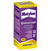 Cola universal para papeles pintados de alta calidad, especialmente indicada para papeles pintados ligeros y pesados y papeles de corcho. Dosificación: -Preparación de la pared: agua por paquete: 10 l. Rendimiento: 100 m2 -Papel ligero: agua por paquete: 8,5 l. Rendimiento: 50 m2 / 10 rollos -Papel mediano: agua por paquete: 7,5 l. Rendimiento: 45 m2 / 9 rollos -Papel pesado: agua por paquete: 6,5 l. Rendimiento: 40 m2 / 8 rollos Preparación y aplicación de la cola: Poner en un cubo la cantidad de agua fría requerida según el tipo de papel. Espolvorear el contenido del paquete en el agua, removiendo al mismo tiempo. Agitar unos instantes. Esperar de 20 a 30 minutos y agitar de nuevo enérgicamente. Metylan Universal estará lista para su uso. Cortar el papel pintado según la altura de la pared dejando 5 cm de margen por cada extremo. Encolar uniformemente el dorso del papel con una brocha, cuidando especialmente los bordes. Doblar el papel sobre si mismo y dejar reblandecer de 5 a 10 minutos antes de su aplicación. Propiedades: -Fácil disolución y aplicación -Transparente: no mancha -Permite un óptimo ajustado del papel -Alto rendimiento -Máxima adherencia
