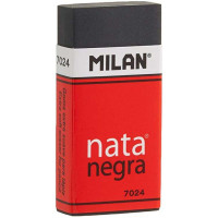 Goma nata de plástico negra, extra suave, con gran poder de absorción. Adecuada para trazos de lápices blandos. No mancha. Con faja de cartón roja y envuelta individualmente. Características: -Color: Negro -Material: Plástico -Forma: Rectangular Especificaciones: -Medidas: 5 x 2.3 x 1 cm -Caja de 24 ud.