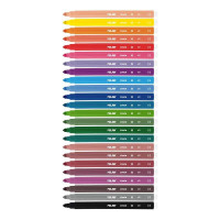 Rotuladores de punta cónica 5 mm Ø que permite realizar trazos desde 0,75 mm a 3 mm. Punta resistente a los golpes y a la presión. Tinta a base de agua que proporciona unos colores brillantes de fácil aplicación y mezclables entre sí. Por su tipo de punta se recomiendan para rellenar superficies de color. Puede lavarse fácilmente sobre la mayoría de tejidos(poner la prenda en remojo en agua fría durante una hora y lavar a máquina, también con agua fría). Con capuchón de seguridad ventilado. 24 colores Características: -Tinta: Al Agua -Color: Surtidos -Diámetro de la punta: 5 mm. -Lavable: Si Especificaciones: -Pack de 24 ud.