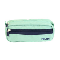 Estuche portatodo rectangular con 2 cremalleras Serie 1918. Inspirada en los colores y diseño originales de las gomas de borrar MILAN, fabricadas en España desde 1918. Con un pequeño bolsillo frontal y un gran compartimento principal. Forro interior estampado azul marino con una cuadrícula que evoca las formas de las gomas MILAN. Tejido exterior \'ripstop\': ligero y resistente a la rotura y rasgaduras. Utiliza una técnica especial que teje hilos gruesos de refuerzo a intervalos regulares en un patrón entrecruzado. Especificaciones: -Estuche Rectangular -Cremallera color azul -Medidas: 21 x 8,5 x 6,1 cm -Composición tejido: Poliéster -Color: Verde