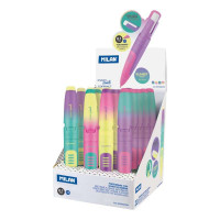 Portaminas eraser & pencil COMPACT edición Sunset. Mina de grafito 0.7 mm dureza 2B, gruesa y suave, que facilita la escritura y es también apropiada para el dibujo artístico. Goma MILAN extra grande. Gomas y minas de recambio disponibles. Características: -Tamaño de la mina: 0.7 mm -Dureza de la mina: 2B -Goma Milan extra grande -Disponible en 4 colores surtidos: amarillo, lila, rosa, turquesa Especificaciones: -Expositor de 20 ud.