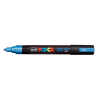 Uni Posca marcador de pintura base al agua Características: -PC-5M Azul metálico 1,8-2,5mm -Punta de poliéster (forma de bala) -Ancho de trazo de 1,8 -2,5 mm -Cuerpo de plástico -Marcador de pintura no permanente. Tinta pigmentada base al agua. Pinta sobre cualquier superficie y es muy resistente a la luz, es inodoro, las manchas se pueden lavar con agua, desapareciendo inmediatamente, ideal para cartelería, decoración, escaparatismo, posters, etc. -NO ES TÓXICO