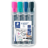 Marcador para Flipchart (bloc de presentación), tinta base agua, sin olor, no traspasa el papel, lavable en la mayoría de tejidos, recargable con cargador flipchart marker 488 56. Punta redonda de 2 mm aprox. Características: -Marcadores Lumocolor con punta bloqueada ? evita que la punta se introduzca en el cuerpo. -Ideal para uso en papel ya que la tinta no se filtra. -La tinta a base de agua se lava de la mayoría de los textiles, sin olor, se seca en segundos. -La tinta Dry Safe significa que los marcadores se pueden dejar sin tapa durante días sin secarse. -Estuche exclusivo STAEDTLER box reutilizable con 4 marcadores de flipchart de punta redonda, rosa, turquesa, azul, negro.