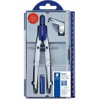 Compás escolar de precisión con rueda de ajuste central, diámetro máximo del círculo 350 mm y con alargadera 450 mm. Recomendado para uso escolar. Estuche de plástico con tapa transparente abatible con borde en forma de regla de 170 mm, con: compás, tubo de minas y adaptador universal. Características: -Compás de precisión con rueda central y mecanismo de ajuste rápido. -Aguja y mina intercambiables. -Patas articuladas. -Con aguja roma antilesiones. -Diámetro máximo del círculo 260 mm aprox., con alargadera 395 mm aprox. -Longitud 156 mm.