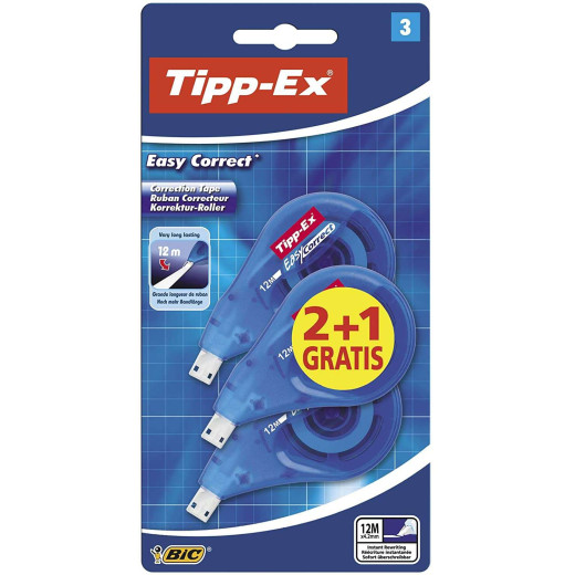 El corrector Tipp-Ex Easy Correct contiene 12 m de cinta correctora de calidad premium, suficiente para una buena temporada. Su práctico sistema de dosificación lateral te permite ver lo que estás corrigiendo. No se rompe mientras corriges, porque utiliza una película de plástico ultrarresistente que se adhiere óptimamente al papel. Corrige y reescribe al instante sobre esta cinta blanca totalmente opaca. Una cinta correctora que se aplica sin problemas ni atascos y que se puede rebobinar cuando te pasas. Caracteristicas: -Dimensiones de la cinta: 4.2 mm x 12 m -Escritura instantánea, no necesita secado. -Corrección precisa tanto para diestros como para zurdos. Especificaciones: -Blister de 3 ud.