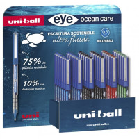 Uni-ball eye Ocean Care micro -UB-150ROP/3D 4COLORES EXPOSITOR 0,5mm Características: -Punta de acero inoxidable -Bola de 0,5 mm de carburo de tungsteno -75% de plástico reciclado. El 10% son deshechos marinos -Código de color en capuchón y puntera -Tinta pigmentada de gran resistencia al agua y a la luz, su exclusivo sistema de control de tinta, además de evitar el goteo, le confiere una increíble suavidad de escritura, incorpora una ventana para controlar el nivel de tinta -Con clip metálico