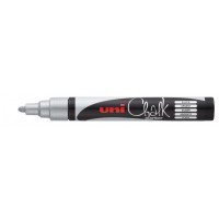 Uni Chalk marcador de tiza liquida -PWE-5M Plata 1,8-2,5mm Características: -Marcador de tiza líquida con borrado en húmedo -Pinta sobre cualquier superficie y es ideal para pizarras negras, blancas, vidrio,? ya que su tinta resiste a la lluvia y a exteriores pero se borra fácilmente con un trapo húmedo -Ideal para anunciar menús, ofertas? -Cuerpo de plástico reciclado -Punta de poliéster cónica